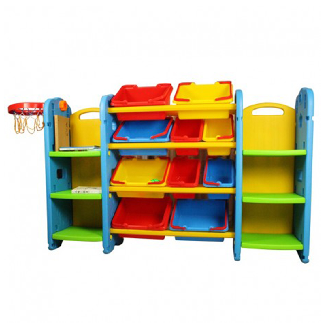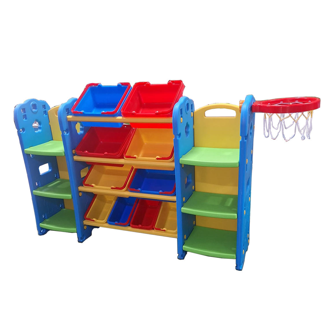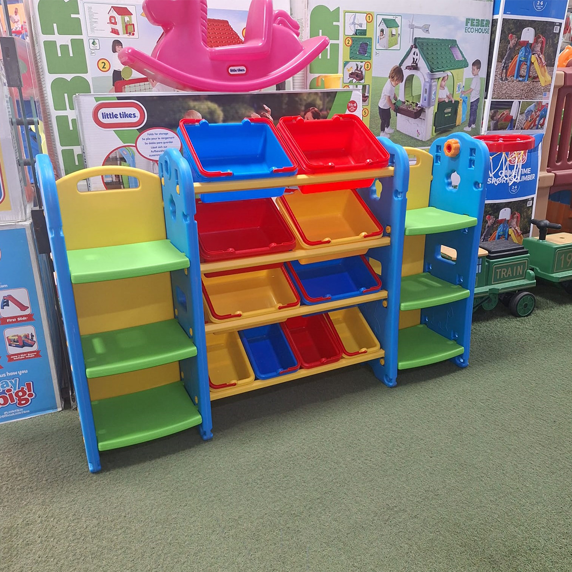 Estructura firme con 6 compartimientos y 10 cajas para guardar los juguetes de los niños, ya sea en el interior o en el exterior.