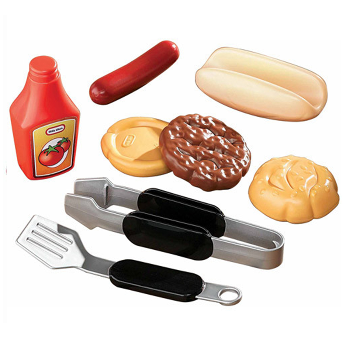 El juego de comida para jugar incluye una hamburguesa, un perrito caliente y utensilios para asar.