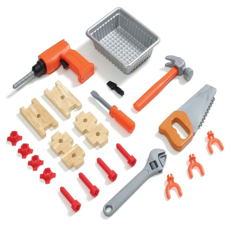 • En la Caja: Banco de trabajo con tornillo de banco, contenedor de almacenamiento, tablero de clavijas, juego de accesorios de 22 piezas que incluye herramientas de simulación y piezas de «madera».