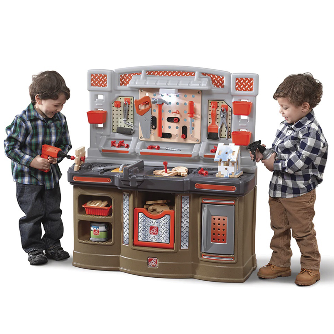 Este gran Taller es un gran banco de trabajo que cuenta con ranuras moldeadas en la superficie de la mesa para mantener las piezas estables durante la construcción y mucho espacio de trabajo.