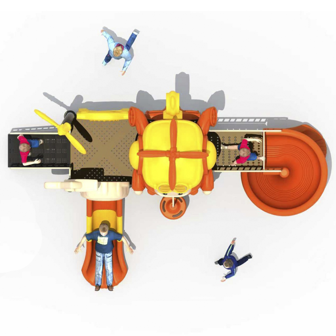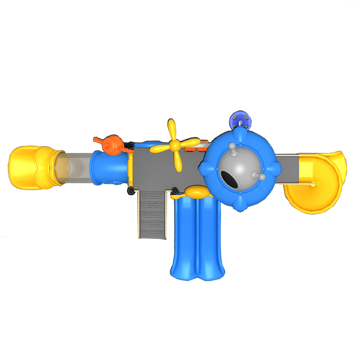Incluye 2 torres unidas entre si 1 tobogan recto y otro tobogan de doble caida, 1escalera y un trepador de discosy accesorios de hélice en la parte alta.
